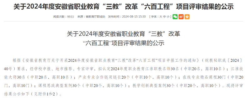 近日,安徽省教育廳公示了2024年度安徽省職業(yè)教育“三教”改革“六百工程”項目,集團(tuán)5所學(xué)校共7個項目入選。