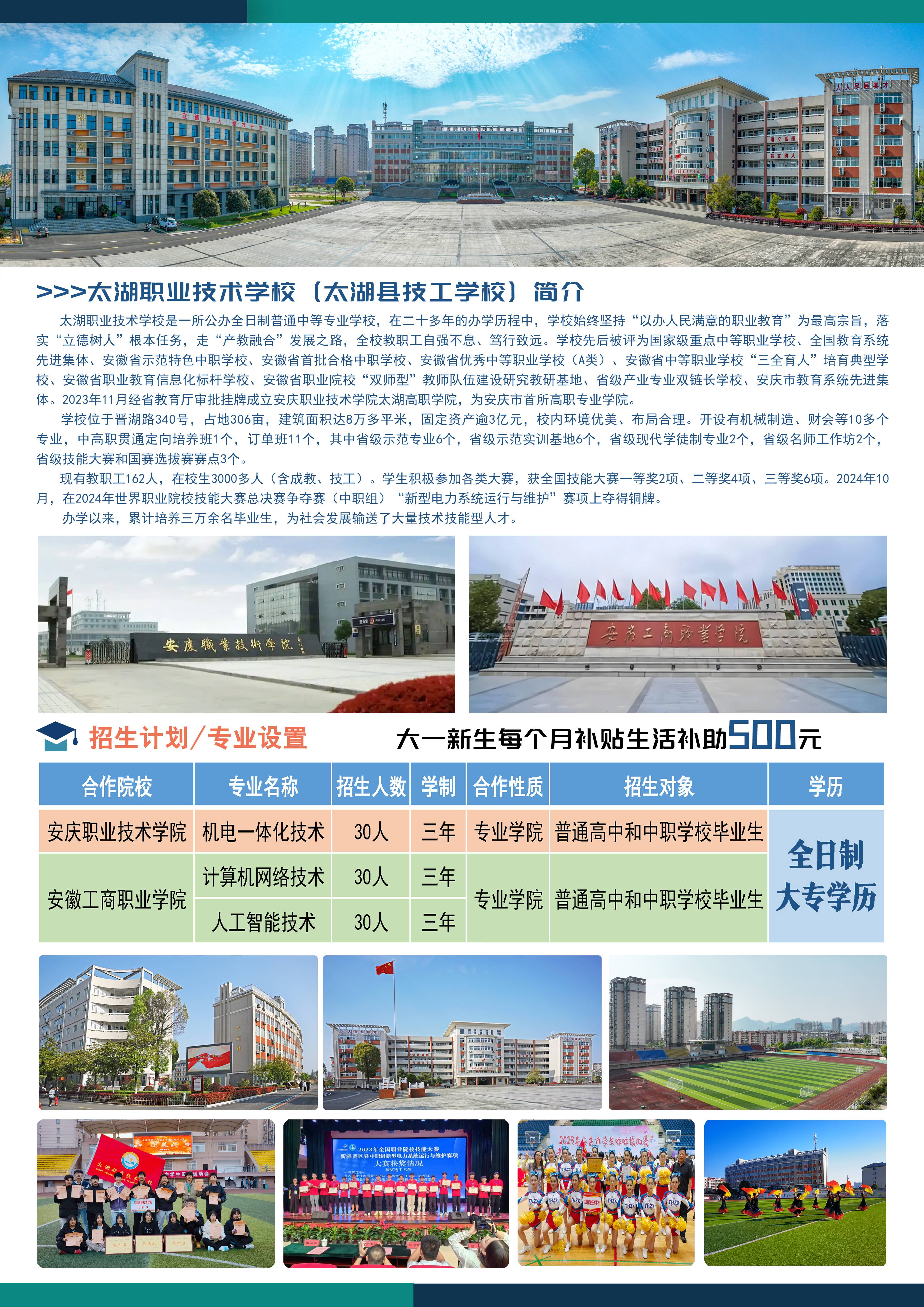經(jīng)省教育廳批準(zhǔn),太湖職業(yè)技術(shù)學(xué)校與安慶職業(yè)技術(shù)學(xué)院、安徽工商職業(yè)學(xué)院聯(lián)合辦學(xué)太湖高職專業(yè)學(xué)院。其中,安慶職業(yè)技術(shù)學(xué)院機電一體化專業(yè)30人,安徽工商職業(yè)學(xué)院計算機網(wǎng)絡(luò)技術(shù)30人、人工智能技術(shù)30人。三個專業(yè)均對接前沿科技就業(yè)崗位,全面滿足企業(yè)人才需求。